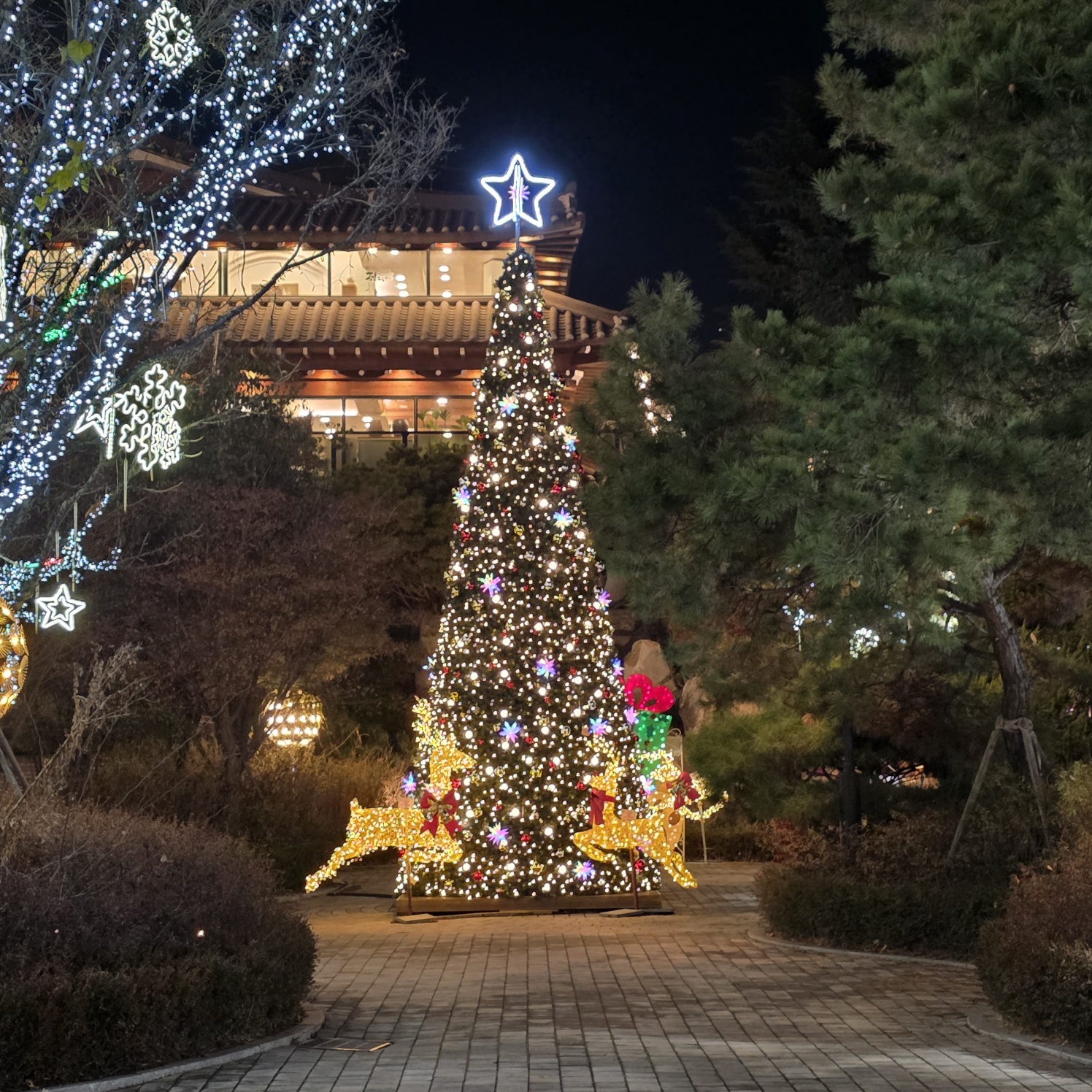 이 트리가 특별하게 느껴진 이유는 화려함보다 빛의 밀도에 있었다. 과도한 장식 대신 은은한 조명이 나무 전체를 감싸며 주변 풍경과 자연스럽게 어우러진다. 특히 한옥 스타일의 건물과 소나무, 조명이 함께 만들어내는 장면은 흔한 크리스마스 연출과는 다른 깊이를 보여준다. 인위적인 연출이 아니라, 공간이 스스로 겨울을 받아들인 느낌이었다.